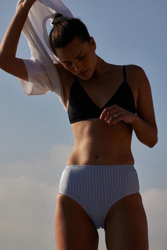 Adoptez le bas de Patchouli rayures bleu ciel qui n’est autre qu’une jolie culotte haute vintage. Pour un total look, associez-la au haut de maillot Figuier rayures bleu ciel.
